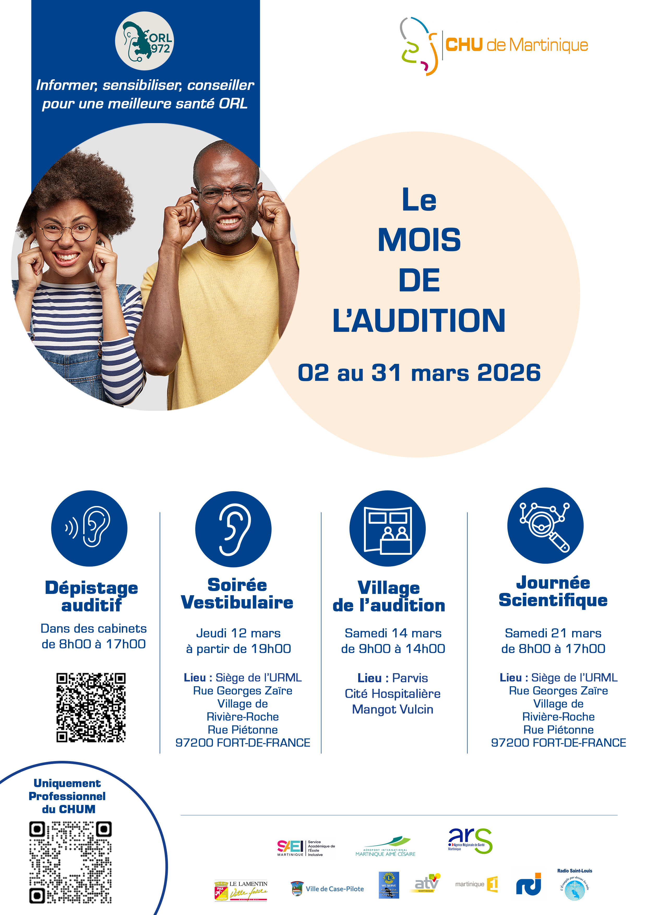 Temps fort de cette mobilisation, un Village de l’audition se tiendra le samedi 14 mars 2026, de 9h à 14h, sur le parvis de l’hôpital Mangot Vulcin, au Lamentin. Ouvert à l’ensemble de la population, cet événement a pour objectif d’informer, de sensibiliser et d’accompagner le public sur les enjeux de la santé auditive : troubles auditifs, les acouphènes, la presbyacousie, solutions d’appareillage...